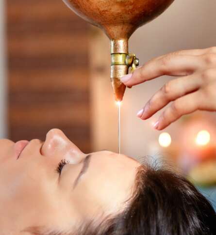 Massage du cuir chevelu avec le shirodara, qui permet d’avoir une goutte à goutte d’huile pendant le temps du massage pour une détente profonde.